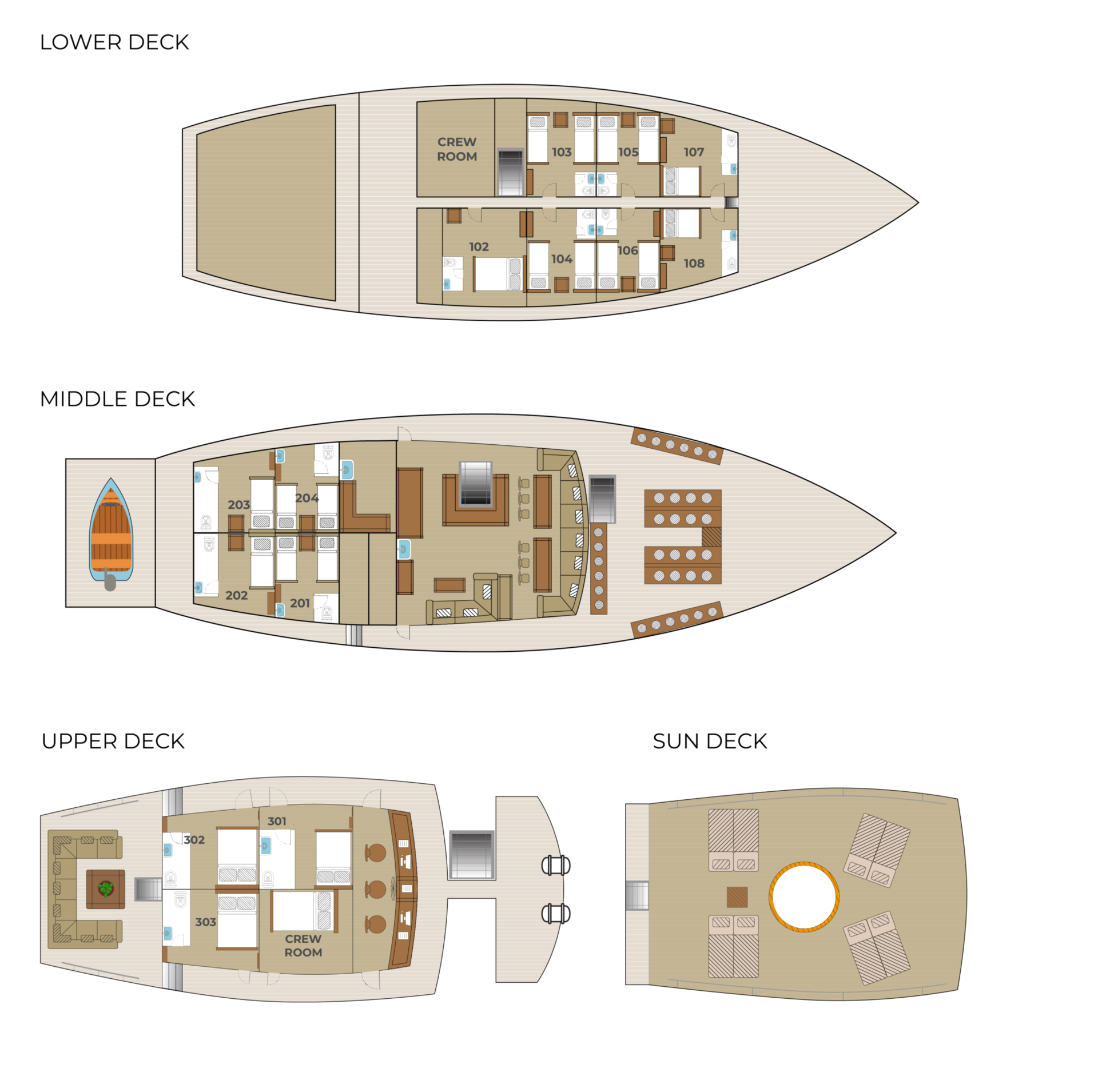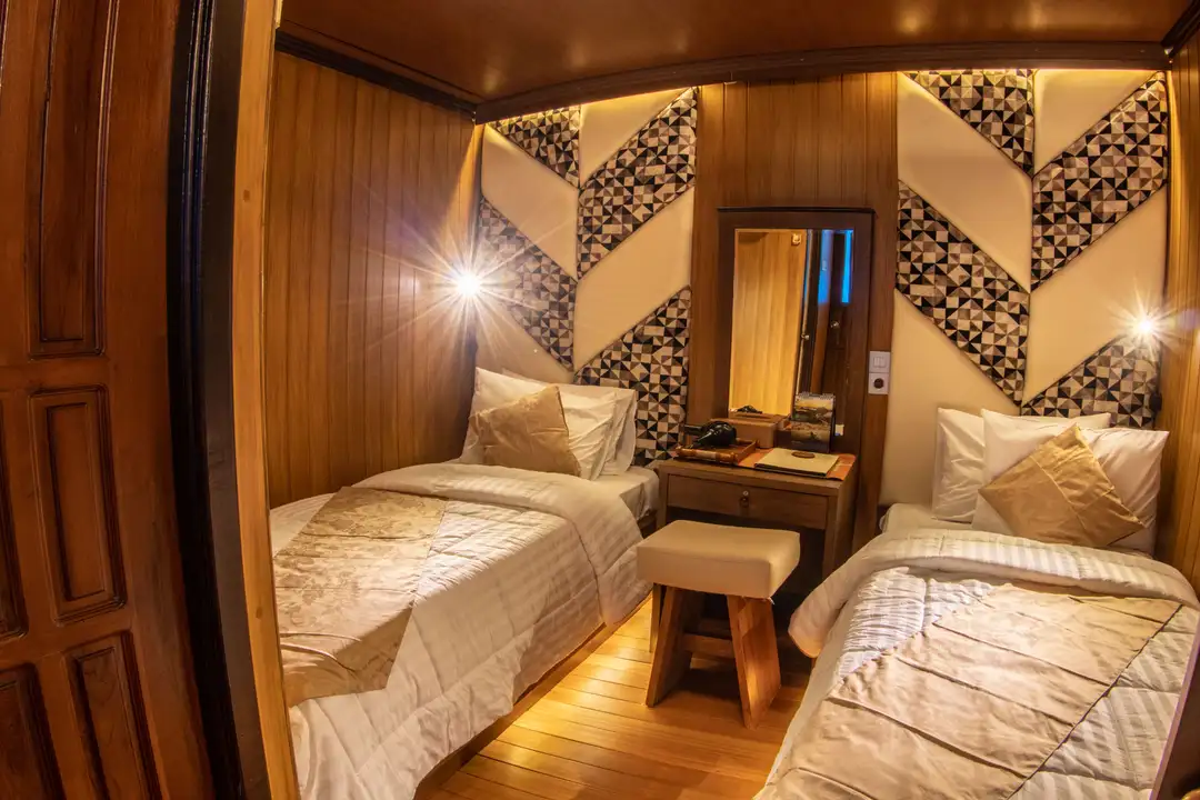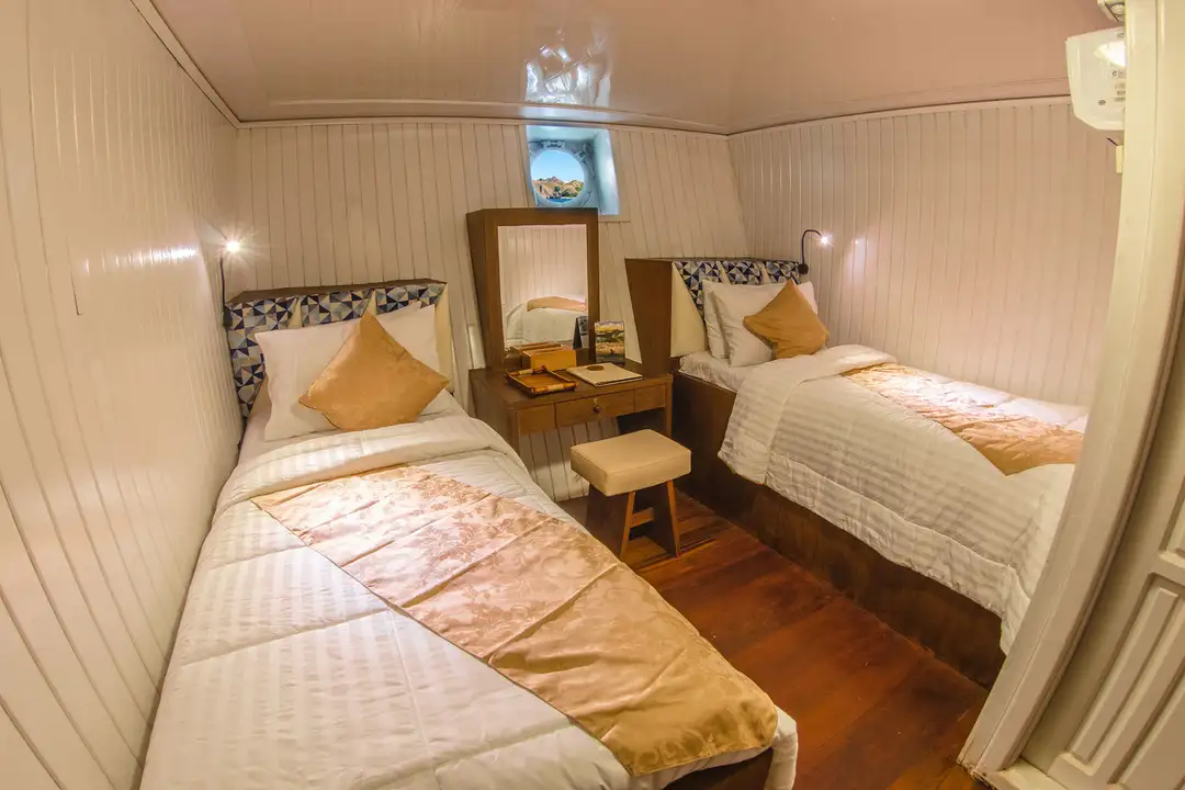 총 14개의 객실 중 미들덱 4개만이 싱글베드로, 빠른 예약을 통해서 같은 금액으로 1인 사용이 가능합니다. 모든 객실에 화장실/샤워실이 있으며 객실내 세면대가 있어 편리함이 장점입니다. 또한 개인용 드라이기와 슬리퍼, 가운이 구비되어 있으며 바다 환경을 보호하기 위해 플라스틱 페트병을 사용하지 않고 알루미늄 개인 물통을 나누어주는 세심함이 돋보이는 친환경적 보트입니다. 자체 정화 시설이 있어 물을 아낌없이 사용할 수 있는 것 또한 여성 다이버들에게 가장 큰 메리트입니다.