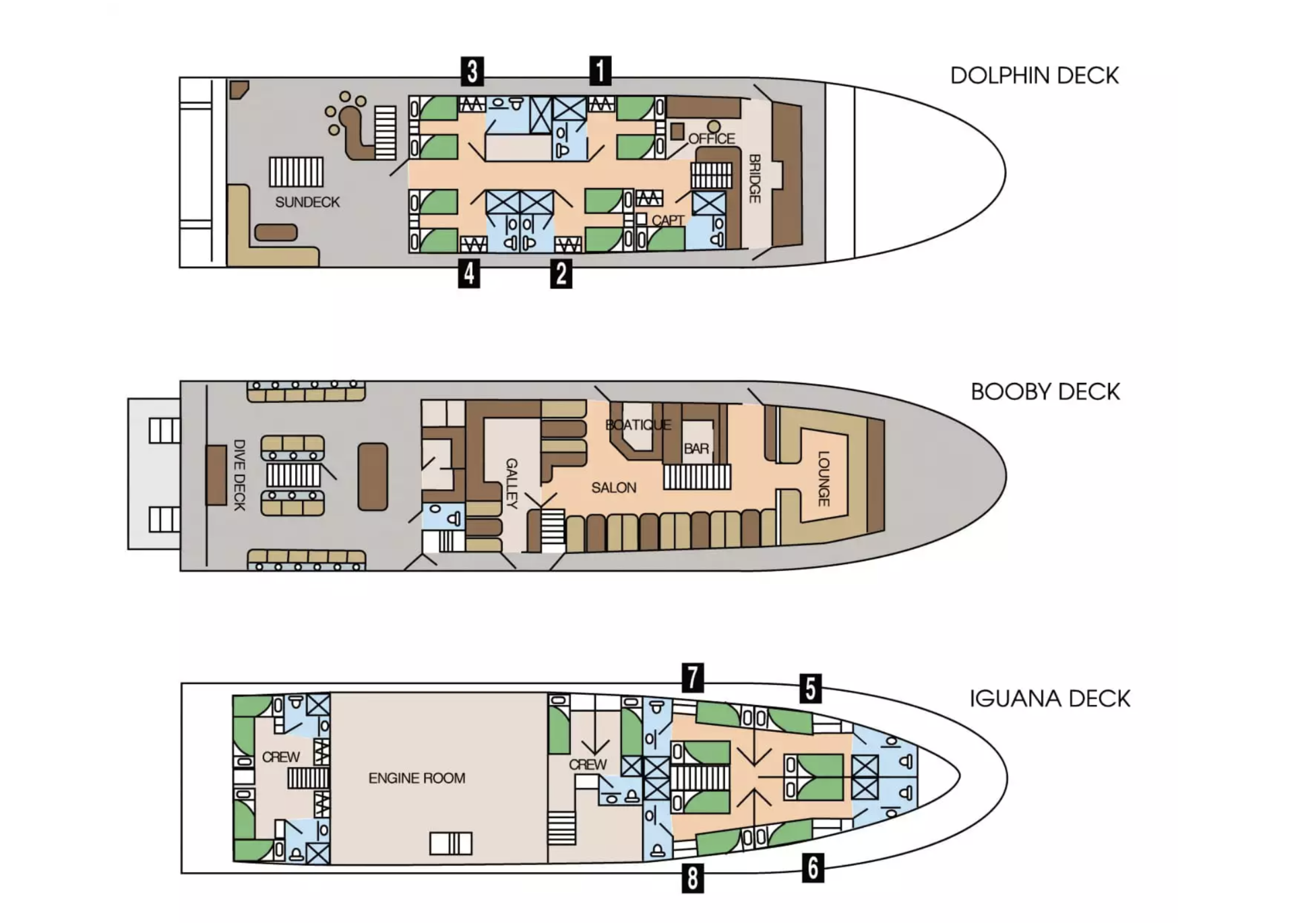 로우덱에 위치한 5–8번 객실은 개별 에어컨을 갖춘 쾌적한 공간으로, 트윈 침대 2개가 제공됩니다.